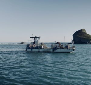 The flat bottom barge designed for mooring and ocean farm servicing and maintenance.